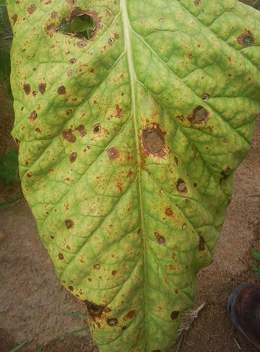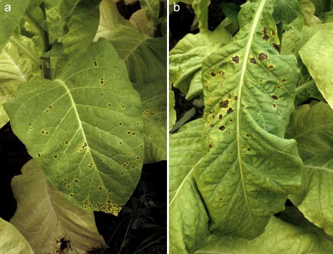Alternaria alternata afeta as folhas mais maduras do tabaco, nas quais primeiro induz pequenas manchas húmidas (figuras 1 a 5). Estes evoluem rapidamente e tornam-se castanhos e circulares, contendo frequentemente anéis concêntricos discretos e rodeados por um halo de tecido clorótico. Em condições úmidas, não é incomum observar uma camada conidial preta, semelhante a veludo, na superfície dos pontos. As lesões podem aparecer nas hastes e pecíolos (figura 6). Observe que os pontos podem depreciar a qualidade das folhas de tabaco curadas (figura 7).