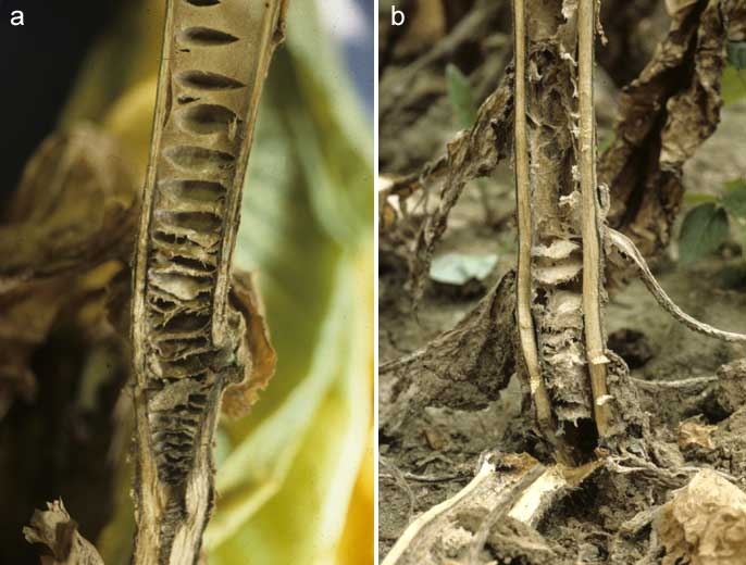 A doença é caracterizada por um rápido amarelecimento e murchamento, seguido pela morte de toda a planta. Um marrom escuro a preto, um pouco afundado, a lesão geralmente aparece no caule (caule) no nível do solo ou perto dele. Esta lesão geralmente se estende até o caule ou haste da planta, fazendo com que ela fique preta. Talos, quando divididos, geralmente revelam o miolo enegrecido separado em discos discretos. Esta característica é de valor diagnóstico apenas quando usada em conjunto com outras observações, porque o disco pode ocorrer devido a outros fatores. Nas observações de campo, notou-se que algumas das variedades mais novas, particularmente aquelas que têm o gene ph, não exibem nenhum disco na medula. O patógeno pode infectar também folhas se salpicado nas folhas inferiores causando grandes lesões marrons.