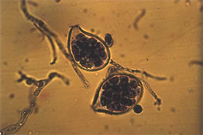 Os zoosporos são geralmente a principal fonte de inóculo. Ao nadarem pela água do solo, são atraídos pelas raízes, encistam, germinam e penetram nos tecidos da raiz. A propagação de zoósporos também ocorre através do ar espirrando água. Uma vez ocorrida a infecção, o fungo invade rapidamente a epiderme e o córtex. Esporângios e clamidósporos são formados rapidamente dentro de tecidos infectados e na superfície da raiz. Eles são responsáveis pelo desenvolvimento da doença.