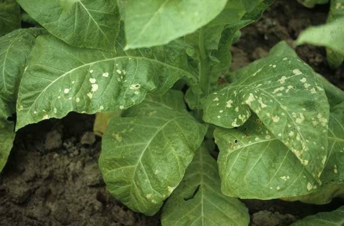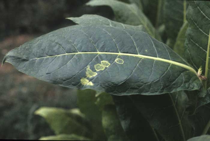 Herbicidas, que em particular interrompem a atividade fotossintética das plantas, causam manchas amarelas em algumas folhas. Observe que os tecidos afetados podem progressivamente se tornarem brancos. Esteja ciente de que o uso de um herbicida na cultura ou perto da cultura nunca é totalmente inofensivo. Fique atento que o uso de herbicidas só podera ser feito com doses específicas e durante determinados estágios de desenvolvimento da cultura: Os riscos de lesões químicas nunca desaparecem totalmente. Outros pesticidas, por exemplo, misturas de inseticidas e fungicidas ou fertilizantes, também podem causar lesões químicas no tabaco.