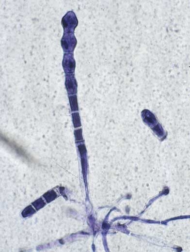 Em 4-6 dias após a infecção, os conidióforos de curta duração nascidos em hifas secundárias formaram-se na superfície da lâmina e produziram conídios. A esporulação é abundante. Os conídios são bastante frágeis e vivem apenas algumas horas ou dias, quando as condições são favoráveis. Eles são muito leves e podem ser facilmente transportados e espalhados pelo vento e incidentalmente por chuvas ou salpicos de água durante a irrigação por aspersão.