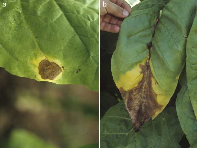 O principal sintoma causado pelo Botrytis cinerea eh observado nas folhas deplantas maduras (figuras 1 e 2) que corresponde a manchas de coloracao marrom claro a bege cercadas por um halo amarelo marcado (figura 3). As fontes do inóculo são geralmente aspétalas das flores senescentes que caem sobre as folhas, daí o nome em inglês da doença "mancha de folha de flores mortas".