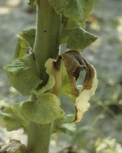 Pectobacterium carotovorum subsp. carotovorum (anteriormente Erwinia carotovora subsp. carotovora) causa grandes lesões escuras e úmidas nas folhas de tabaco (figuras 1 e 2). Um halo amarelo, devido à toxina emitida pela bactéria pode ser observado ao redor das manchas (figura 2). Note que as partes florais (figura 3) também podem estar infectadas.