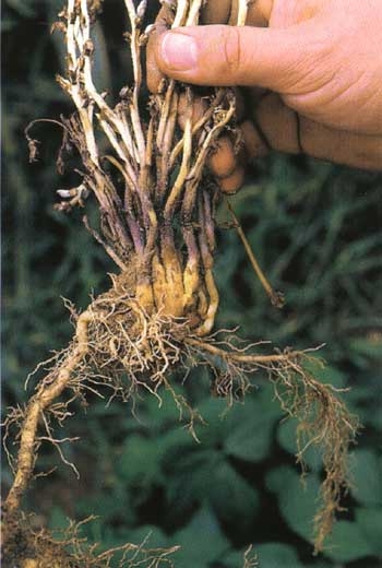 ♦ Em alguns países (EUA, Itália e América Central), brotos brancos e suculentos de vários centímetros, parecendo Orobanche , são às vezes observados. Este sintoma é chamado de "falso Orobanche". Estes rebentos de botões, iniciando a partir de raízes de plantas de tabaco, podem ser causados por um desequilíbrio hormonal da planta. Sintomas semelhantes foram associados aos efeitos da bactéria Gram +, Rhodococcus fascians (Tifford) Goodfellow.