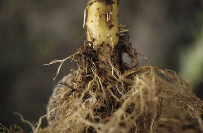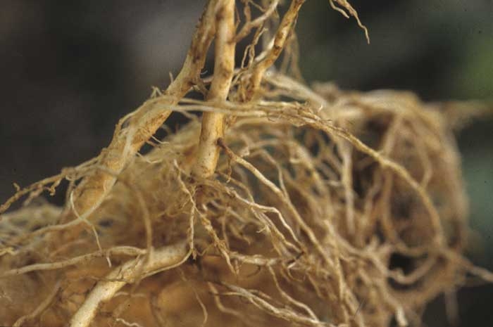Nematoides endoparasiticos migratórios "nematoides de raiz" (figura 1) penetram no córtex da raiz e gradualmente destroem muitas células, induzindo abundantes lesões avermelhadas a pretas nas raízes (figuras 2-4). Estes sintomas são semelhantes aos induzidos por T. basicola, exceto pela presença de areas com aparencia decortiças nas raízes. Adultos, larvas e ovos são frequentemente visíveis em células do córtex (figura 5), e podem confirmar o diagnóstico