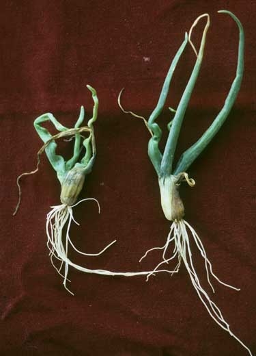 - No crescimento novo das plantas. As folhas recentemente desenvolvidas crescem de forma assimétrica e são "torcidas" (figura 1). Se o clima não for favorável para o crescimento do tabaco, o desenvolvimento de plantas jovens pode ser retardado ou interrompido, resultando em plantas raquíticas;