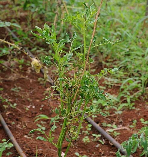 - tentar erradicar o(s) primeiro(s) surto(s) eliminando as primeiras plantas afetadas e/ou tratando-as localmente e as plantas vizinhas. Para ser eficaz contra os ácaros, as aplicações devem envolver um grande volume de mistura e esta com pressão suficiente para atingir o "coração" da vegetação. A eficácia dos tratamentos deve ser monitorada ao longo do tempo (observe que nenhum pesticida é autorizado para uso de tomate em ephy e que P. latus desenvolveu resistência a vários pesticidas em todo o mundo);