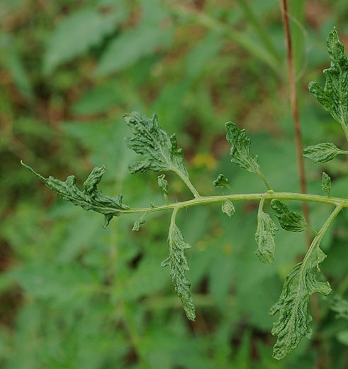 As folhas se enrolam fortemente, também são enrugadas, mais grossas e rígidas. Eles às vezes têm uma tonalidade de bronze a marrom e sua parte inferior tem reflexos metálicos. Áreas de tecido acastanhado e cortiço aparecem sob as folhas, nos pecíolos, etc.