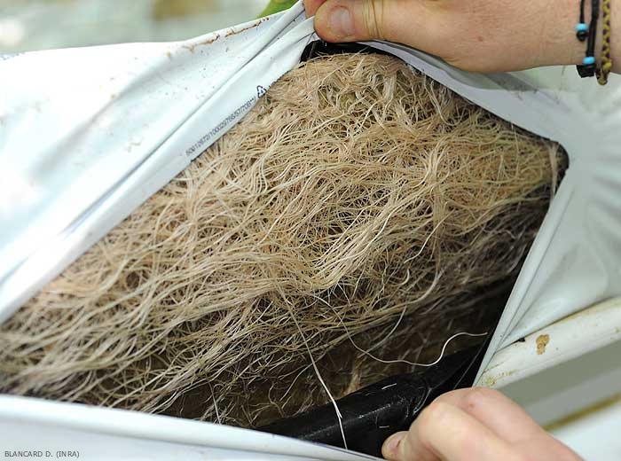 As plantas afetadas apresentam proliferação radicular bastante linear no interior e na superfície dos cubos e placas de lã de rocha (foto 514), o que leva ao aumento do crescimento vegetativo do tomateiro em detrimento da frutificação. Observe que o tamanho das frutas pode ser reduzido. Além disso, a densidade das raízes as torna muito mais susceptíveis ao ataque de fungos presentes em cultivos sem solo, em especial aos cromistas ( Pythium spp., Phytophthora spp.).