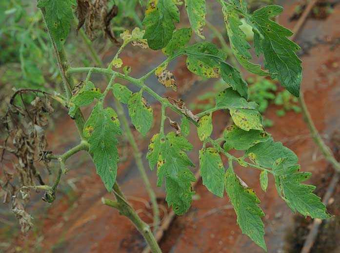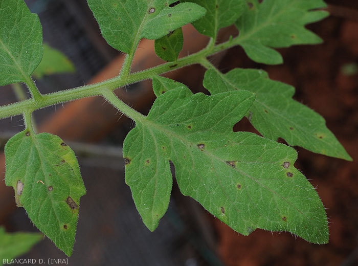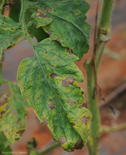 Na presença de Corynespora cassiiicola , aparecem pequenas lesões úmidas na face superior das folhas (figuras 1 e 2). Possuem crescimento radial e às vezes são limitados localmente por uma nervura (figura 2). De forma bastante circular, podem atingir 2 cm de diâmetro e são circundados por um halo amarelo bem visível (figura 6). Padrões concêntricos também estão presentes em certos pontos, lembrando os de um alvo (pontos-alvo) (FIGS. 3 a 6). As manchas podem ser comparadas às causadas por A. tomatophil a.