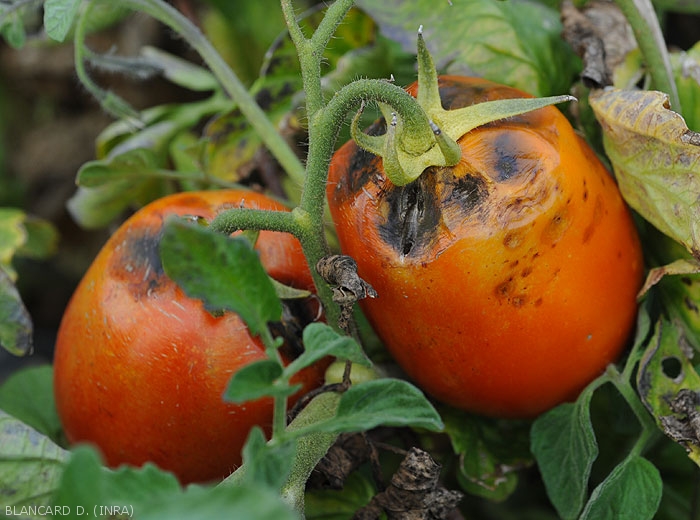 A princípio aparecem nos frutos lesões de tamanho limitado e de contorno mal definido, côncavas e úmidas. Frequentemente localizam-se perto do pedúnculo ou na zona peduncular dos frutos denominada "ombro" ( ombro ) pelos anglo-saxões (figuras 1 a 3). Posteriormente, eles gradualmente se estendem e os tecidos subcuticulares localizados em seu centro logo se tornam marrons e depois pretos. Deve-se notar que a Alternaria alternata pode colonizar secundariamente a ponta dos frutos (figura 4), como outras espécies de Alternaria , e em particular as lesões causadas pela doença fisiológica chamada necrose apical do tomateiro.