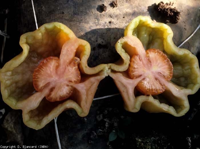 O interior dos frutos é mais ou menos oco. As cavidades loculares estão parcialmente vazias, com pouco gel e sementes (figura 2). Os frutos são, portanto, mais leves e ocos.