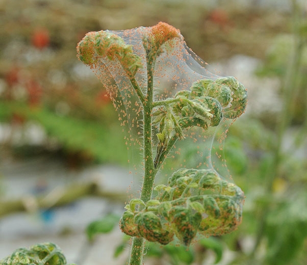 - Fases de desenvolvimento : os ovos (1) (figura 10) são depositados principalmente na face inferior dos folíolos. Eles são redondos, minúsculos (0,14 mm de diâmetro), translúcidos no início, depois tornam-se opacos e, eventualmente, tornam-se amarelos à medida que se aproximam da eclosão. As larvas (2) (figura 11), que possuem 3 pares de patas, são inicialmente muito pálidas, depois adquirem um tom esverdeado. Eles têm dois pontos vermelhos nos olhos, bem como dois pontos escuros no meio do corpo. As protoninfas (3) (figura 12), de tamanho maior, possuem quatro pares de patas e sua coloração varia do verde claro ao verde escuro; eles também têm mais dois pontos contrastantes em seu corpo. As deutoninfas (4) são maiores que as protoninfas, mas da mesma cor. É na fase adulta (5) (figuras 13 e 14) que podemos distinguir os machos das fêmeas: a fêmea, oval, mede 0,5 a 0,6 mm de comprimento. Sua cor é variável (laranja, amarelo claro, verde claro a verde escuro, até vermelho). O macho é mais ativo, menor e mais estreito que a fêmea. Também possui uma cor variável (amarelo claro a laranja, amarelo escuro a marrom). No tomate, T. urticae é frequentemente avermelhada.
