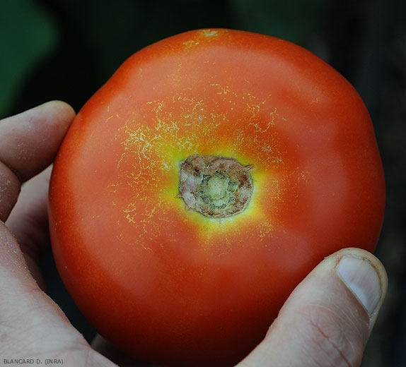 Manchas cloróticas minúsculas, mais ou menos dispersas, aparecem sobre e sob a lâmina foliar dos folíolos do tomateiro (Figuras 1-5). Este amarela gradativamente e assume uma cor opaca (Figuras 3) . Estas manchas também são visíveis no caule (figura 6) e nos pecíolos, mas também em alguns frutos (figura 7).