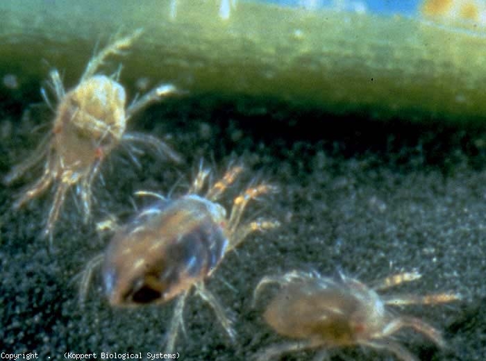 Os acarianos ( mariposas ), que, como os insetos, pertencem ao ramo dos artrópodes, pertencem à classe dos aracnídeos (aranhas, etc.). Os adultos têm quatro pares de pernas, ao contrário dos insetos que têm apenas três. Várias famílias de ácaros incluem espécies de plantas nocivas, sendo a mais conhecida a Tetranychydae ; essas espécies são comumente referidas como “ácaros” amarelos, vermelhos ou verdes ou mesmo “aranhas”. Observe que algumas espécies atacam o tomate, incluindo Tetranychus urticae (Koch), que é o ácaro mais relatado nesta cultura. Também chamado de "ácaro tecelão" ( ácaro aranha ) por causa das teias que forma nas plantas, é cosmopolita, comum e muito polífago, pois relatou cerca de 2.000 espécies de plantas. Pode ser responsável por danos significativos, até mesmo infestações por raios, especialmente sob abrigo, em muitas culturas ornamentais e vegetais. Casos de resistência a acaricidas têm sido repetidamente relatados neste ácaro. outras espécies de Phytophagous Tetranychidae ácaros predadores , bem como Phytoseiidae , podem ocasionalmente ser encontrados em tomates.