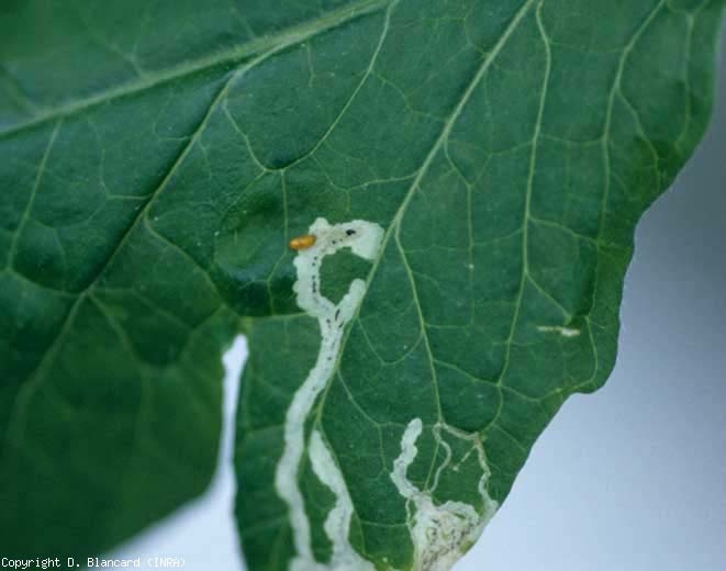 Numerosos poços nutricionais cloróticos são observados pela primeira vez na lâmina; podem ser muito numerosos e são realizados pelas fêmeas com seu ovipositor. As minas (figuras 1 e 2) aparecem posteriormente nos folhetos. As folhas mais afetadas, às vezes carregando cerca de vinte larvas por folha, podem amarelar, murchar e secar. A atividade fotossintética das plantas, seu crescimento e produção podem, portanto, ser bastante reduzidos durante uma infestação. O controle das populações dessas pragas é muitas vezes problemático devido à sua possível resistência a vários inseticidas, estes últimos também eliminando a fauna útil (parasitóides Hymenoptera). Acrescente-se que durante as pululações muito fortes, notadas em particular nas zonas tropicais, os frutos apresentam queimaduras ( queimaduras solares - sunscald ) porque muitas folhas minadas e alteradas já não as protegem da radiação solar.