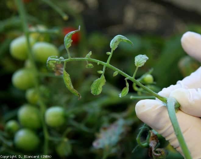 - Symptômes : les plantes sont rabougries et leurs folioles subissent une épinastie prononcée, accompagnée de nécroses nervaires.