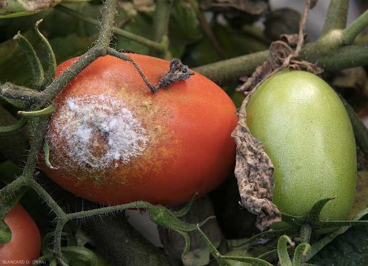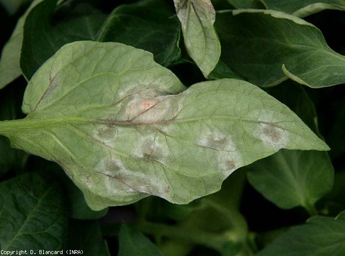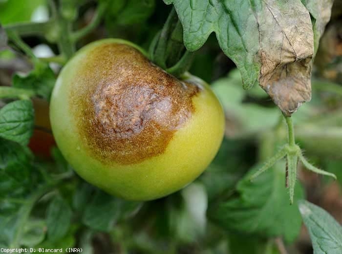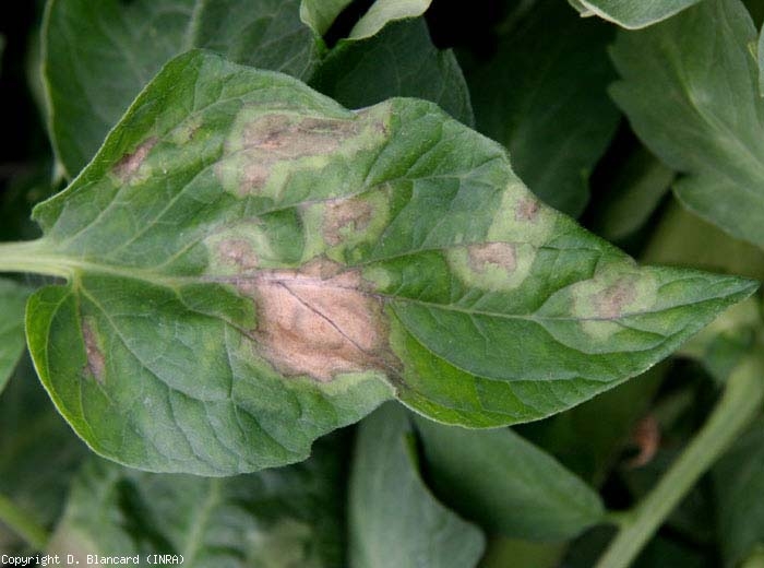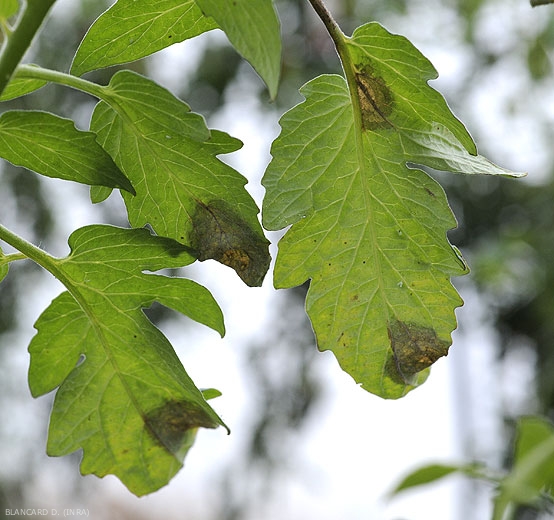 O míldio pode atacar todas as partes aéreas dos tomates . Caracteriza-se pelo desenvolvimento de manchas inicialmente úmidas , ou mesmo praias, nos folíolos (figuras 1 e 2). Esses ataques dão localmente aos tecidos afetados uma coloração verde-clara a marrom-esverdeada . Porções significativas da lâmina acabam sendo afetadas e logo tornam-se castanhas e necróticas (figuras 3 e 4). Essas manchas são freqüentemente circundadas por uma margem de tecido lívido e mal definido, sobre a qual às vezes se forma, na parte inferior da lâmina, uma discreta e fugaz penugem branca composta por esporocistóforos e esporocistos de P. infestans (figuras 5 e 6). . Quando as condições são particularmente favoráveis, a progressão dos sintomas nas bulas é rápida. Folhas, galhos e até plantas acabam necrosando e secando completamente (figura 7).