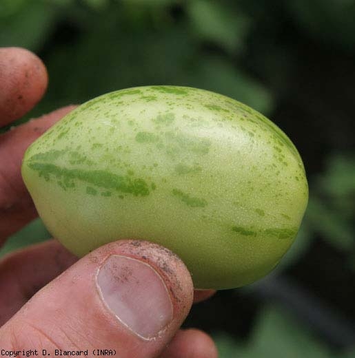 Os poucos sintomas observáveis nas fotos ilustram esta condição, que afeta principalmente as lavouras sob cobertura em áreas de produção localizadas em latitudes setentrionais. Observe que esses sintomas ocorrem em qualquer estágio do desenvolvimento do tomate e são caracterizados por: