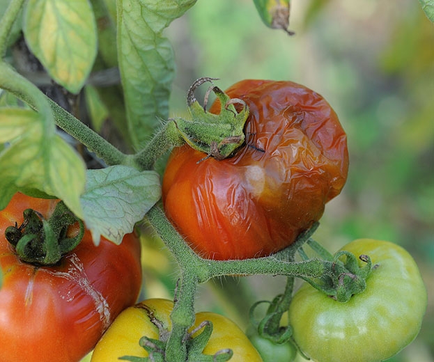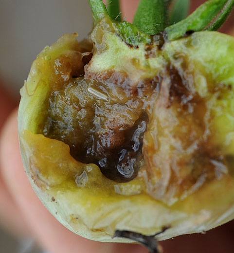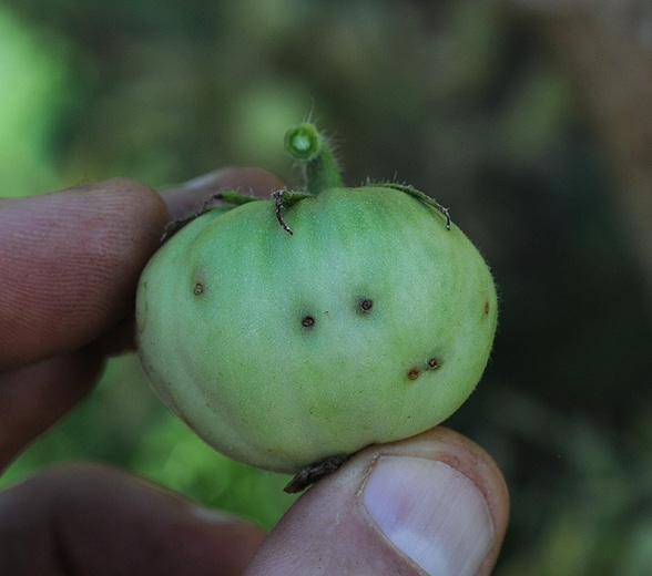 Os frutos afetados apresentam caroços correspondentes às perfurações dos adultos; geralmente são claramente visíveis (figuras 6 e 7). Paralelamente ao desenvolvimento e danos ligados à atividade das larvas, os frutos são colonizados por vários bioagressores patogênicos ou oportunistas que gradualmente levam ao seu apodrecimento (figuras 8 a 10). Em Mayotte, esta espécie causa danos significativos aos tomates, que podem afetar a maior parte da cultura se não forem tratados.