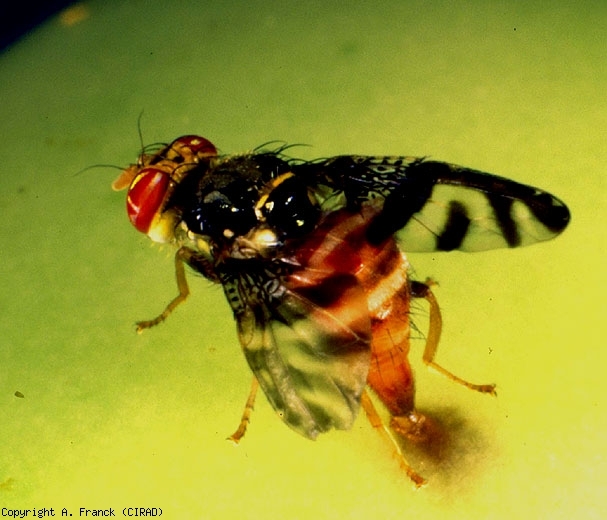 O acasalamento inicia-se logo após a emergência dos adultos (figuras 1 e 2) (já às 48 h), podendo ocorrer desde a manhã até o meio da tarde, com frequência máxima no meio do dia. Como a maioria das outras espécies de Tephritidae, os machos (Figura 3) atraem as fêmeas (Figura 4) emitindo um feromônio sexual ativo de perto. A postura dos ovos nas fêmeas começa 4 a 6 dias após o acasalamento. Usando seu oviscapto pontiagudo, as fêmeas depositam seus ovos sob a epiderme do fruto hospedeiro, alguns milímetros de profundidade. A atividade de nidificação ocorre geralmente no período da tarde, com pico entre 16h e 17h. Os ovos eclodem após 3 a 4 dias de incubação. As larvas então se enterram na polpa da fruta onde o ciclo larval, que inclui três estágios, dura de 7 a 11 dias. No final do seu desenvolvimento, as larvas (figura 5) deixam o fruto com uma expansão repentina para afundar até uma profundidade rasa no solo, onde se transformam em pupas. Estádio pupa dura de 2 a 15 dias. Assim, dependendo das condições climáticas, o ciclo completo é distribuído em 26 a 35 dias. Estudos de estímulos visuais atraentes mostram que adultos de ambos os sexos são preferencialmente atraídos por amarelo fluorescente, enquanto fêmeas maduras são fortemente atraídas por esferas laranjas brilhantes. O estudo de estímulos olfativos atrativos para adultos deve possibilitar em breve uma armadilha adequada para o monitoramento de populações.