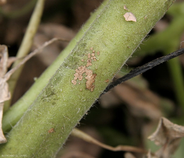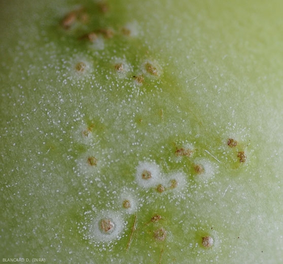 Raras e minúsculas manchas cancerosas , primeiro brancas e depois bege à medida que se suberizam, podem aparecer nos folíolos , nos seus pecíolos , nas hastes (figuras 10 e 11) e nos frutos temporariamente húmidos (figuras 12 e 13). Eles materializam a contaminação aérea local de C. michiganensis subsp. michiganensis . Nos frutos, as manchas têm uma forma muito característica que lembra o olho de um pássaro. Eles são brancos, elevados, alguns milímetros de diâmetro (3 a 4 mm) e têm um centro marrom escuro. Quando eles estão próximos um do outro, eles podem se fundir.