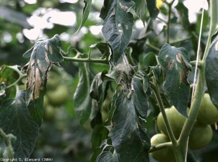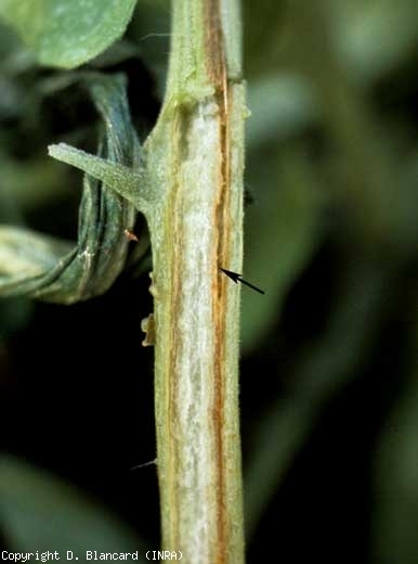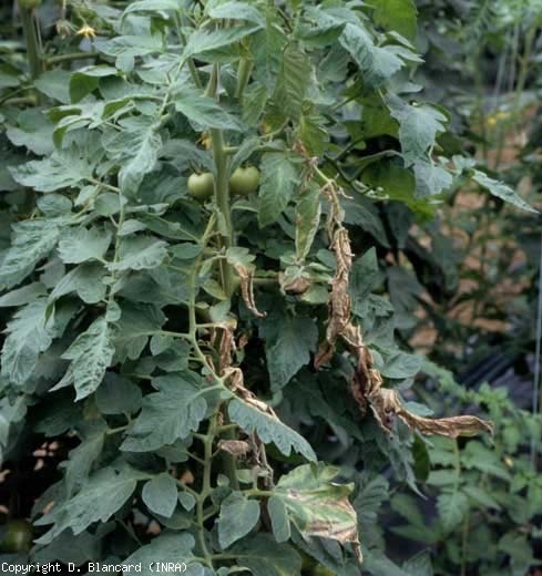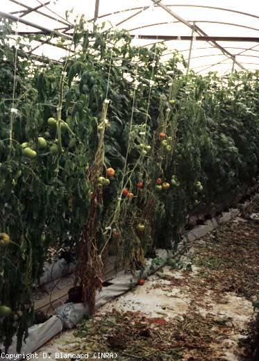 Plantas gravemente afetadas produzem frutos menores , mal coloridos ou que caem prematuramente. Uma seção transversal mostra vasos vasculares frequentemente descoloridos. Embora a doença possa ocorrer em qualquer momento do ciclo de desenvolvimento do tomateiro, é especialmente quando a planta começa a frutificar que ela se manifesta particularmente. O tempo entre a contaminação e o aparecimento dos primeiros sintomas varia principalmente de acordo com as condições climáticas. Pode ser bastante curto, cerca de 2 a 3 semanas e, por vezes, atingir pelo menos 3 meses. Em muitos casos, várias plantas contíguas na mesma linha são afetadas (figura 9). Esta distribuição em linha resulta da transmissão da bactéria durante as operações de cultivo (poda, derriça, colheita, etc.).