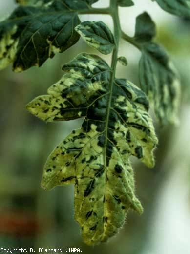 Os sintomas causados pelo vírus do mosaico do tabaco ( Tobacco mosaic virus , TMV) variam de acordo com as cepas. Pode-se observar nos folíolos e nas folhas de manchas claras, um mosaico verde a amarelo (figuras 1 a 3). Em condições de inverno, ocorrem deformações nas folhas. A largura dos folíolos é bastante reduzida, neste caso falaremos de “filiformia” (figuras 4 e 5).