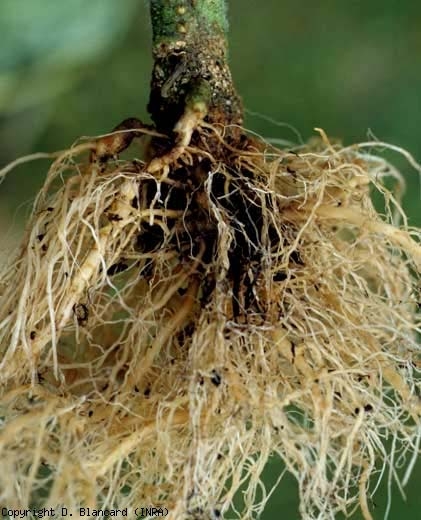 - lesões húmidas e castanhas nas raízes, por vezes atingindo o colo, levando à sua decomposição;
