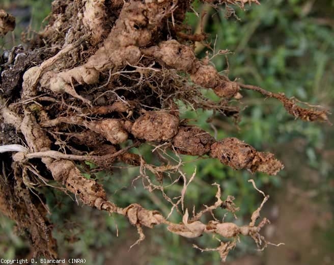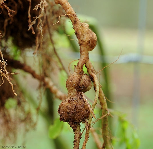 Galhas brancas (figuras 1 e 5), gradativamente amarronzadas, mais ou menos grandes e regulares caracterizam a presença de Meloidogyne spp. ; nematóides nas raízes. A natureza e a extensão das galhas dependem da espécie e do nível de inóculo no solo. As produzidas por Meloidogyne hapla são bastante pequenas porque este nematóide invade os meristemas apicais e, portanto, afeta uma proporção menor das raízes, as induzidas por M. arenaria são do tamanho de uma pérola e afetam quase todas as raízes. As outras duas espécies principais, M. incognita e M. javanica , causam grandes galhas (Figuras 3 e 6) às vezes cobrindo todo o sistema radicular. Observam-se também dilatações longitudinais mais ou menos tortuosas e extensas (figuras 2, 5 e 7).