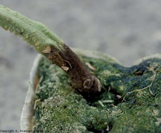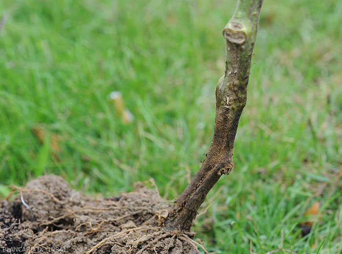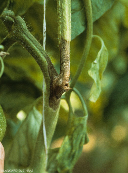 Os cancros : na sua parte inferior, à superfície do , com tecidos ligeiramente deprimidos, podem aparecer a diferentes níveis do caule solo ou logo abaixo (pé negro) (figura 1), em altura ao nível das feridas de desfolha e desbrota ( Figura 2). Eles são bastante úmidos e marrom escuro . A epiderme e o córtex gradualmente se decompõem (Figura 3), e o tecido do xilema torna-se marrom . Esses cancros gradualmente se estendem e envolvem o caule e/ou os pecíolos, perturbando assim as correntes de seiva. Eventualmente, não é de se estranhar o amarelecimento, murchamento e ressecamento dos folíolos localizados a jusante das lesões. Quando um cancro envolve a coroa, toda a planta pode morrer.