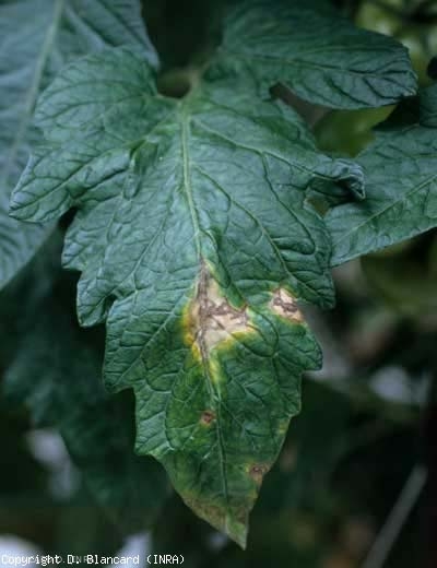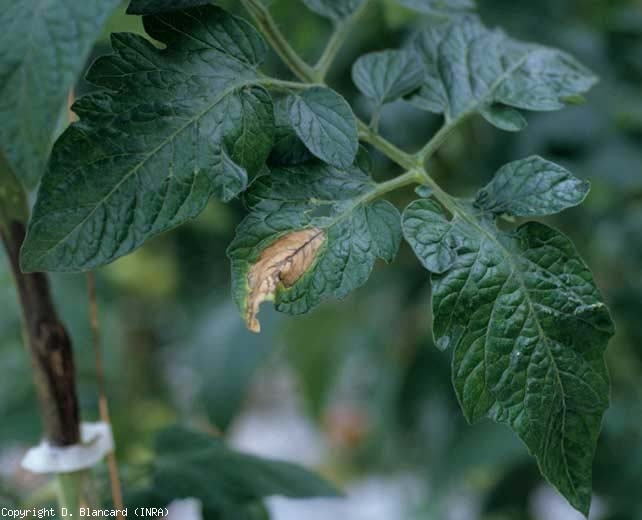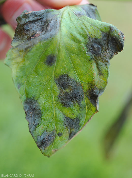 Nos folíolos , observam-se manchas inicialmente marrons e úmidas , principalmente localizadas na periferia da lâmina, e evoluindo rapidamente até cobrir setores por vezes importantes (figuras 5 a 7). Padrões marrons em arabescos mais ou menos concêntricos são claramente visíveis nos tecidos lesados. Essas manchas, muitas vezes cloróticas na periferia, eventualmente tornam-se necróticas e secam . Os tecidos decompostos podem cair. As flores também seriam atacadas e destruídas.