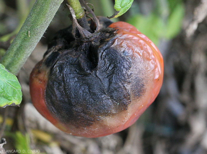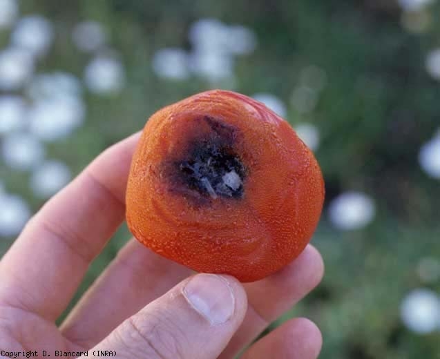 As alterações , muitas vezes ao também se desenvolvem nos frutos nível da cicatriz do caule; estes são úmidos, pretos e evoluem muito rapidamente (figura 4). Eventualmente, grandes manchas com anéis concêntricos cobrem o fruto. Estes podem gradualmente mumificar ou cair . Os sintomas nos frutos também aparecem durante o armazenamento e comercialização.