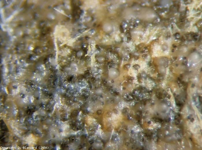Em todos os órgãos afetados, minúsculas estruturas globulares (distinguíveis a olho nu, mas mais facilmente com uma lupa) (figura 8) e mais ou menos marrons a pretos pontilham os tecidos alterados. São muito numerosos nos frutos, mais esparsos nos caules, raros nos folíolos.