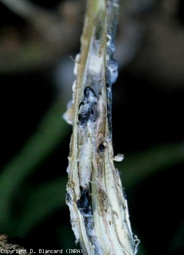 mais ou menos fofo Forma-se um micélio e branco nos tecidos afetados. Observamos, no caule mas também na medula completamente decomposta e oca, escleródios que permitem diferenciar estas duas Sclerotinia spp. :