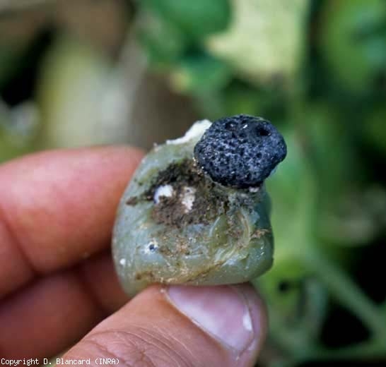 Os folíolos, assim como os frutos (figura 7), também são afetados pela podridão úmida e mole, causando a desintegração dos primeiros e a liquefação dos segundos. Assim, os frutos verdes jovens sofrem grandes alterações úmidas e escuras mais ou menos recortadas.