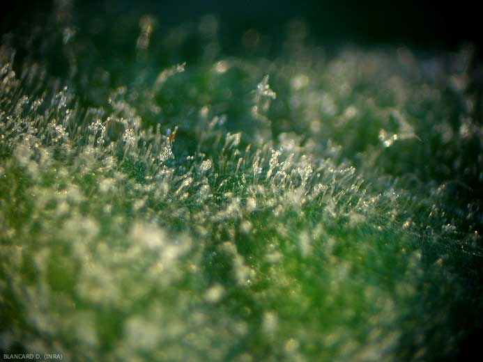 Nos poucos dias seguintes às contaminações, pequenos conidióforos nascem nas hifas secundárias formadas na superfície da lâmina e produzem os conídios (figura 2). A esporulação é muito abundante (figuras 3 e 4). Os conídios (figura 5) são bastante frágeis e vivem apenas algumas horas ou mesmo alguns dias quando as condições lhes são favoráveis. São muito leves e por isso são facilmente transportados e disseminados pelo vento , e secundariamente pela chuva ou salpicos durante a rega por aspersão.