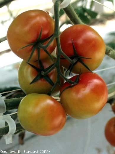 Bemisia tabaci (aleurode, whitefly) induit une coloration en taches des fruits (figure 1). Des informations plus détaillées sur cet insecte sont consultables au niveau du thème Fumagine et ravageurs associés.
