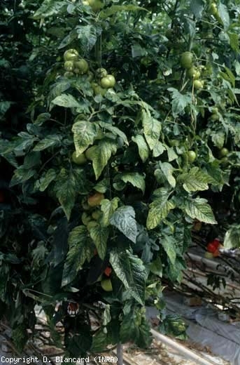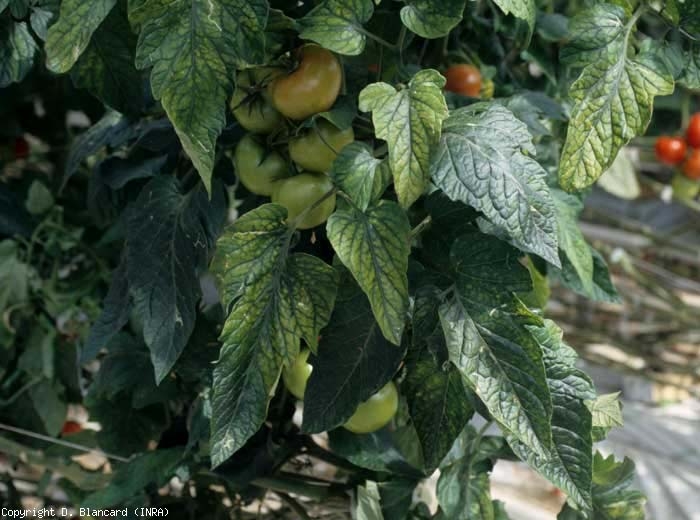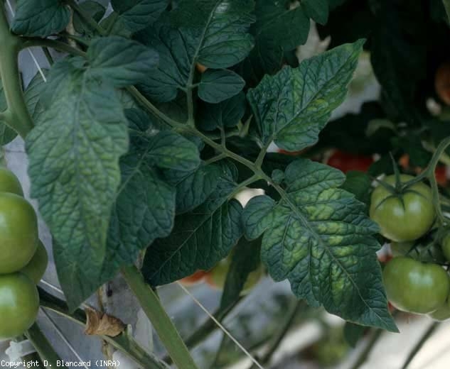 Os primeiros sintomas causados pelo vírus da clorose do tomateiro ( Tomato chlorosis virus , ToCV ) aparecem nas folhas inferiores e médias das plantas distribuídas aleatoriamente na cultura. Assim, manchas cloróticas, ou mesmo manchas cloróticas irregulares, aparecem entre as nervuras dos folíolos e se espalham gradativamente (figuras 1 a 3). Às vezes, pequenas alterações necróticas avermelhadas a marrons são visíveis na lâmina. Posteriormente, o amarelecimento gradualmente se espalha para as folhas superiores. Após algumas semanas, algumas plantas apresentam clorose internerval bastante forte, generalizada a muitas folhas (figura 4), as nervuras dos folíolos permanecem verde-escuras e contrastam com o restante do limbo. As plantas eventualmente envelhecem prematuramente; as folhas velhas engrossam, enrolam e tornam-se quebradiças. Às vezes, eles secam.