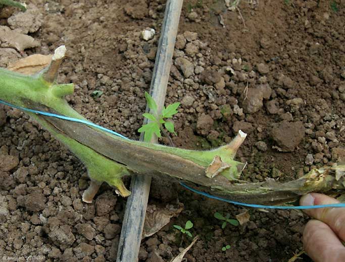Esses sintomas do caule, acompanhados de murchamento, não devem ser confundidos com os causados pela Pseudomonas corrugata responsável pela medula negra.