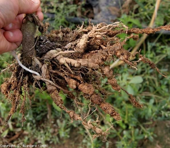 Observe que ataques combinados por esta bactéria e nematóides das galhas às vezes ocorrem nos mesmos sistemas de raízes de tomate (Figura 4). Nesta situação, desenvolvem-se tumores e galhas que por vezes são difíceis de distinguir se os sintomas são avançados (Figura 5).