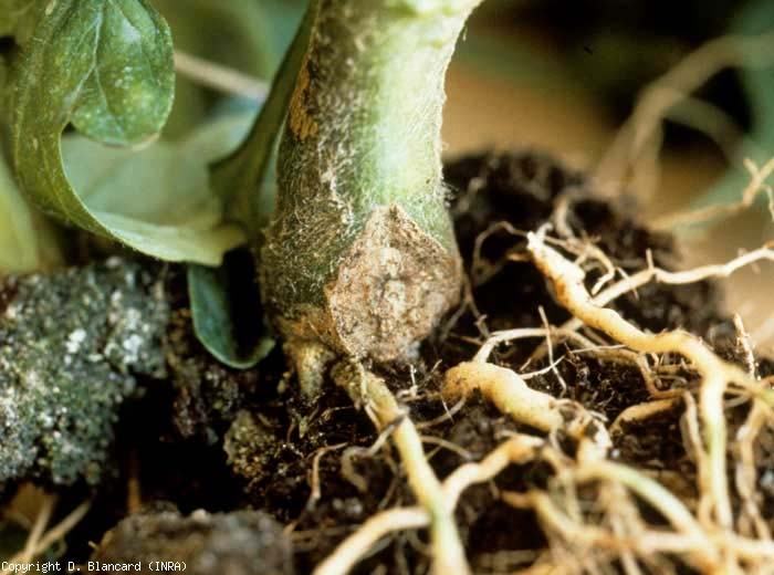 - suberização e necrose do colar (cujo diâmetro por vezes é maior) e do pivô que sofrem rupturas mais ou menos significativas (figura 1). Estas últimas devem-se, em parte, à perda de elasticidade dos tecidos do córtex que, após a suberização, têm mais dificuldade em ajustar-se ao alargamento do caule. Deve-se notar que esses surtos às vezes permitem que microrganismos oportunistas proliferem e levem ao escurecimento dos tecidos profundos e dos vasos mais superficiais. O enfraquecimento do colar também pode levar ao acamamento das plantas;