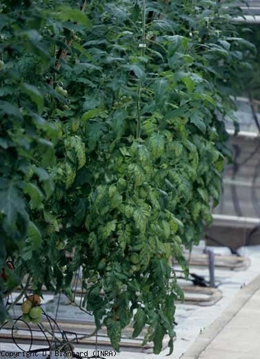 Os sintomas de deficiência aparecem primeiro nos folíolos jovens e depois podem generalizar-se a toda a folhagem do tomateiro