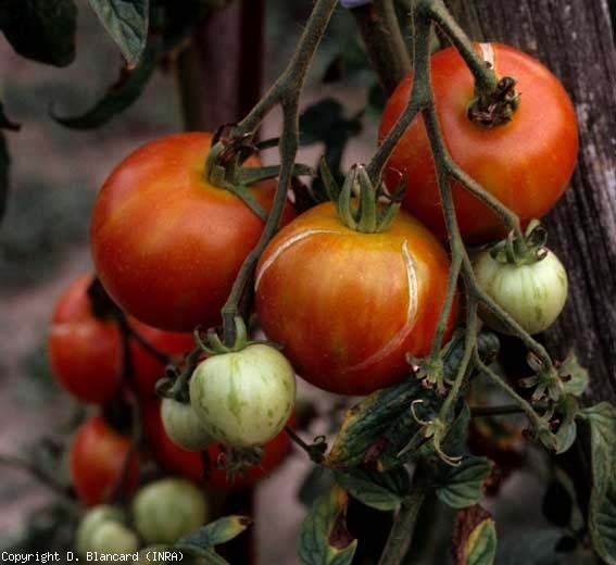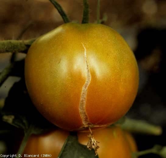 Fissuras, rebentando mais ou menos profundas e extensas, ocorrendo preferencialmente nas zonas pedunculares e por vezes estilares dos frutos ( fissuras de crescimento ). Estas ranhuras podem ser longitudinais, radiais ( fissuras radiais , figuras 1 a 3) e até concêntricas ( fissuras concêntricas ) (figura 4). Quanto mais cedo eles ocorrem, mais prejudiciais eles são.