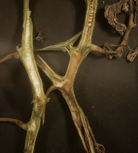 Danos podem ocorrer em tomates após tempestades. Nesse caso, os produtores observam em suas parcelas zonas circulares mais ou menos largas de plantas murchas secando gradualmente. Alguns deles, localizados mais no centro das lareiras, podem ser completamente destruídos. Esses focos correspondem de fato ao ponto de impacto do raio ( relâmpago ) na cultura. O caule dessas plantas também é afetado e ocasionalmente apresenta alterações marrons superficiais. A medula pode permanecer branca ou ficar levemente marrom quando permanece dentro do caule. Freqüentemente, retrai mais ou menos e assume a aparência de vários discos empilhados (figura 1) .