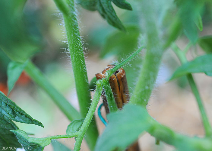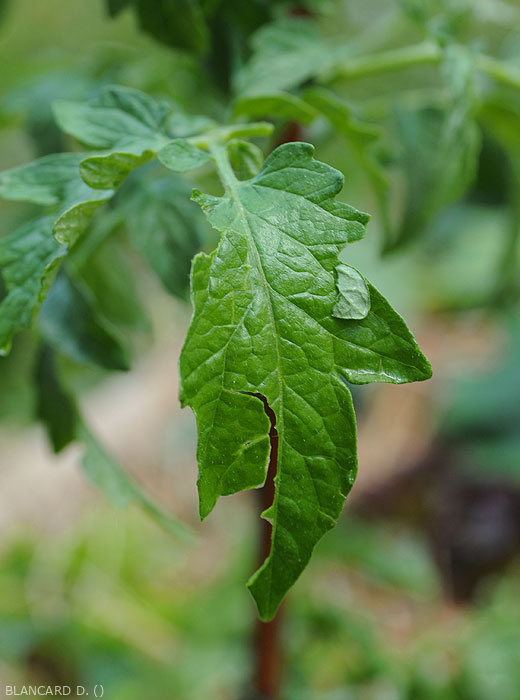 ) nas lavouras de tomateiro Após chuvas intensas, acompanhadas de granizo, não é incomum observar danos significativos ( injúrias de granizo , principalmente quando são cultivadas na horizontal. De fato, esse modo de produção os torna particularmente vulneráveis ao granizo. Estas últimas, ao baterem nas folíolos, provocam furos, rasgos (figura 1), que podem alterar muito seu potencial fotossintético a partir de então. Algumas folhas podem ser totalmente trituradas. Cabe ressaltar que essas diferentes feridas também podem favorecer a instalação de diversos agentes patogênicos. O granizo é também a causa de alterações necróticas acastanhadas, fendilhação mais ou menos pronunciada no seu ponto de impacto no caule (figura 2), mas sobretudo nos frutos.