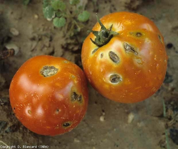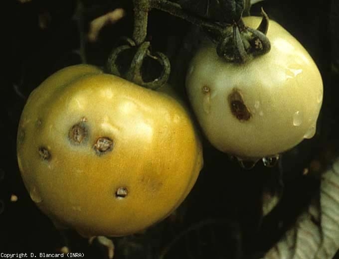 Com efeito, os frutos são particularmente vulneráveis ao granizo que, quando os atinge, provoca rebentamentos mais ou menos acentuados nos pontos de impacto. Surgem posteriormente lesões acastanhadas nos pontos de impacto (figuras 3 a 5) mais ou menos suberizadas, que por vezes lembram as manchas cortiças causadas por Xanthomonas spp ..