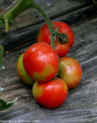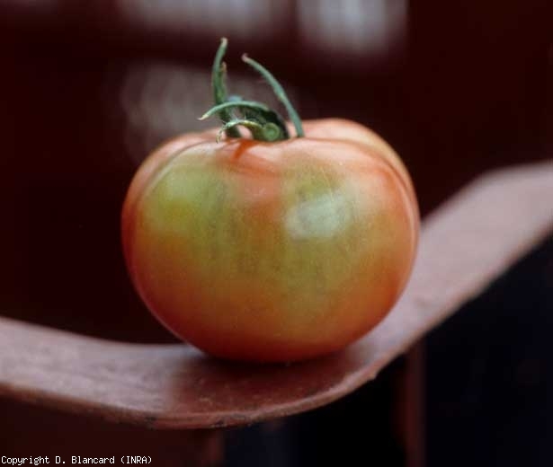 Zonas verdes a amarelas mais ou menos extensas, surgindo nos frutos maduros (figuras 1 a 3), de consistência firme e impróprias para comercialização. Ou seja, amadurecimento parcial dos frutos em manchas ( amadurecimento manchado ) ocorrendo mais na zona peduncular. Um corte transversal nos frutos permite confirmar o seu amadurecimento parcial, bem como o escurecimento de certos vasos do pericarpo nas zonas ainda verdes (escurecimento interno, escurecimento interno ).