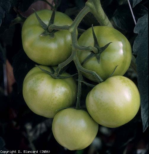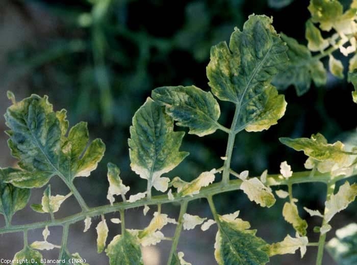 As Figuras 1 a 6, exemplificativas de algumas anomalias de coloração nos folíolos e nas folhas do tomateiro causadas por pesticidas, e mais particularmente herbicidas, devem permitir que você se familiarize com os sintomas causados pela fitotoxicidade. Estas anomalias de coloração podem ser múltiplas: tonalidade esverdeada ou lívida dos folíolos, amarelecimento, branqueamento, antocianização, aspecto baço e/ou bronzeado da lâmina foliar… O amarelecimento é de longe o sintoma mais frequente; podem ter intensidade e distribuição diferentes nos folíolos e nas folhas: