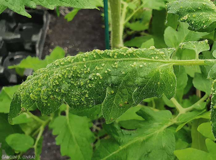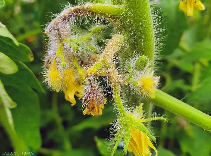Manchas cloróticas mais ou menos distribuídas perto das nervuras freqüentemente aparecem nas folhas inferiores (figura 1). Na verdade, essas manchas se formam quando o equilíbrio hídrico entre a absorção radicular e a evapotranspiração nas plantas é perturbado, com as últimas absorvendo mais água do que podem remover em condições de abrigo. Segue-se então uma saturação de água dos tecidos foliares na origem das intumescências. Estas correspondem a ilhas de células, localizadas na parte inferior do limbo, que se “empanturraram” de água, resultando por vezes na ruptura da epiderme. Assim, formam-se edemas de aspecto úmido a oleoso (figuras 2). Posteriormente, as células acabam por estourar e os tecidos suberizantes assumem uma tonalidade acastanhada (Figura 3). Além disso, em condições particularmente húmidas, a presença de numerosas intumescências leva à deformação e enrolamento de numerosos folíolos (figura 4). Saiba também que as intumescências também se podem formar no caule (figura 5), nos pecíolos e nas inflorescências (figura 6).
